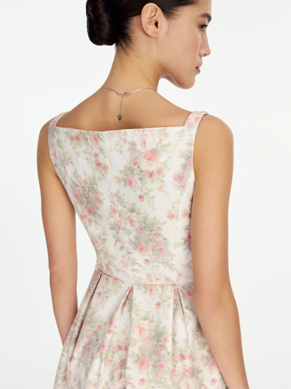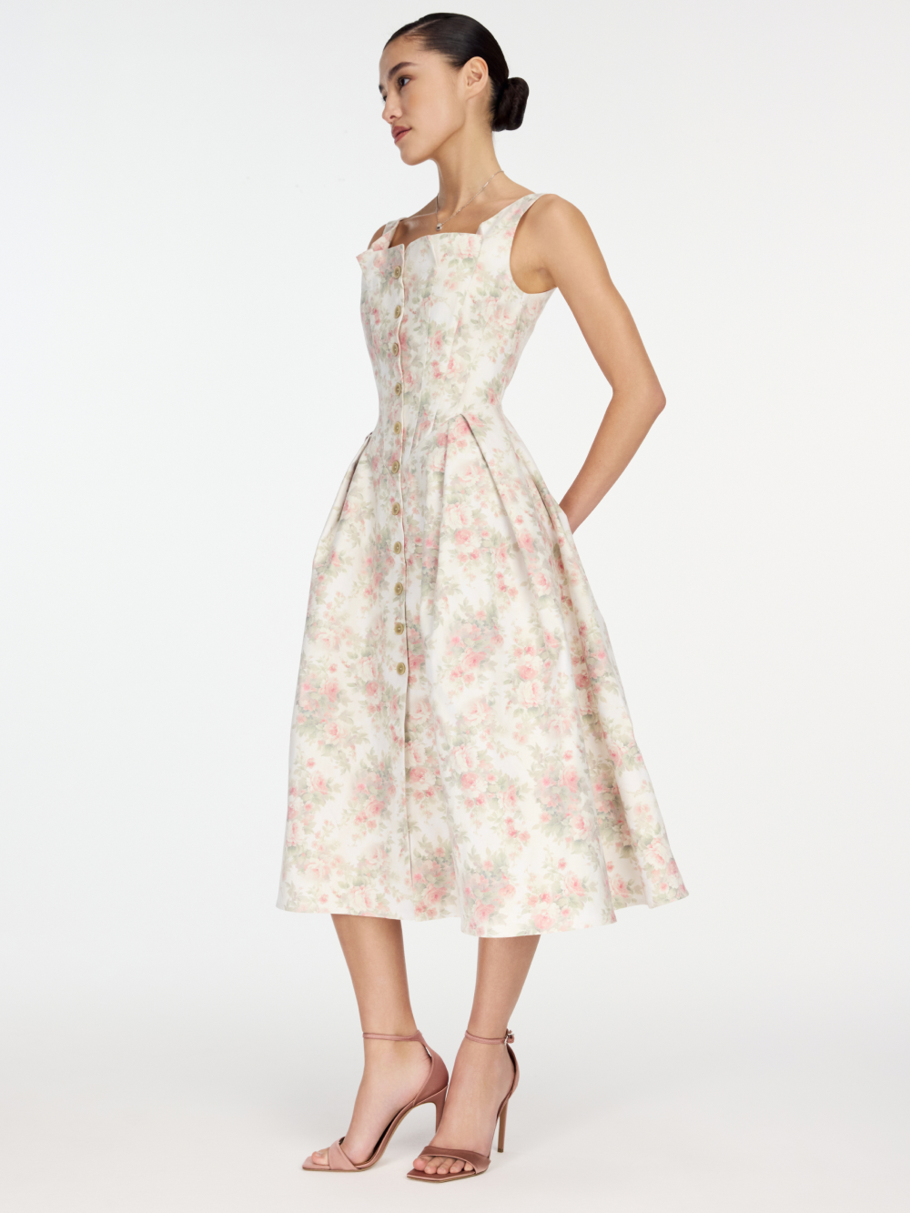 Платье миди для создания хрупкого женственного образа. Корсетный лиф и пышная юбка формируют очерченный силуэт и подчёркивают тонкость талии. Красивую форму юбки помогают поддерживать глубокие складки и внутренняя баска, предусмотренная нашими дизайнерами. Платье выполнено из плотной ткани на основе хлопка и дополнено мягкой хлопковой подкладкой. Застегивается на пуговицы.