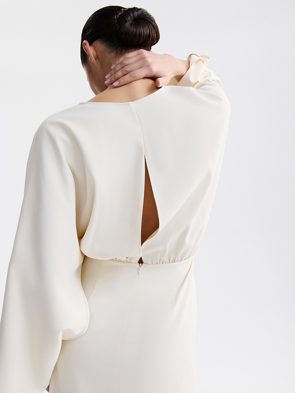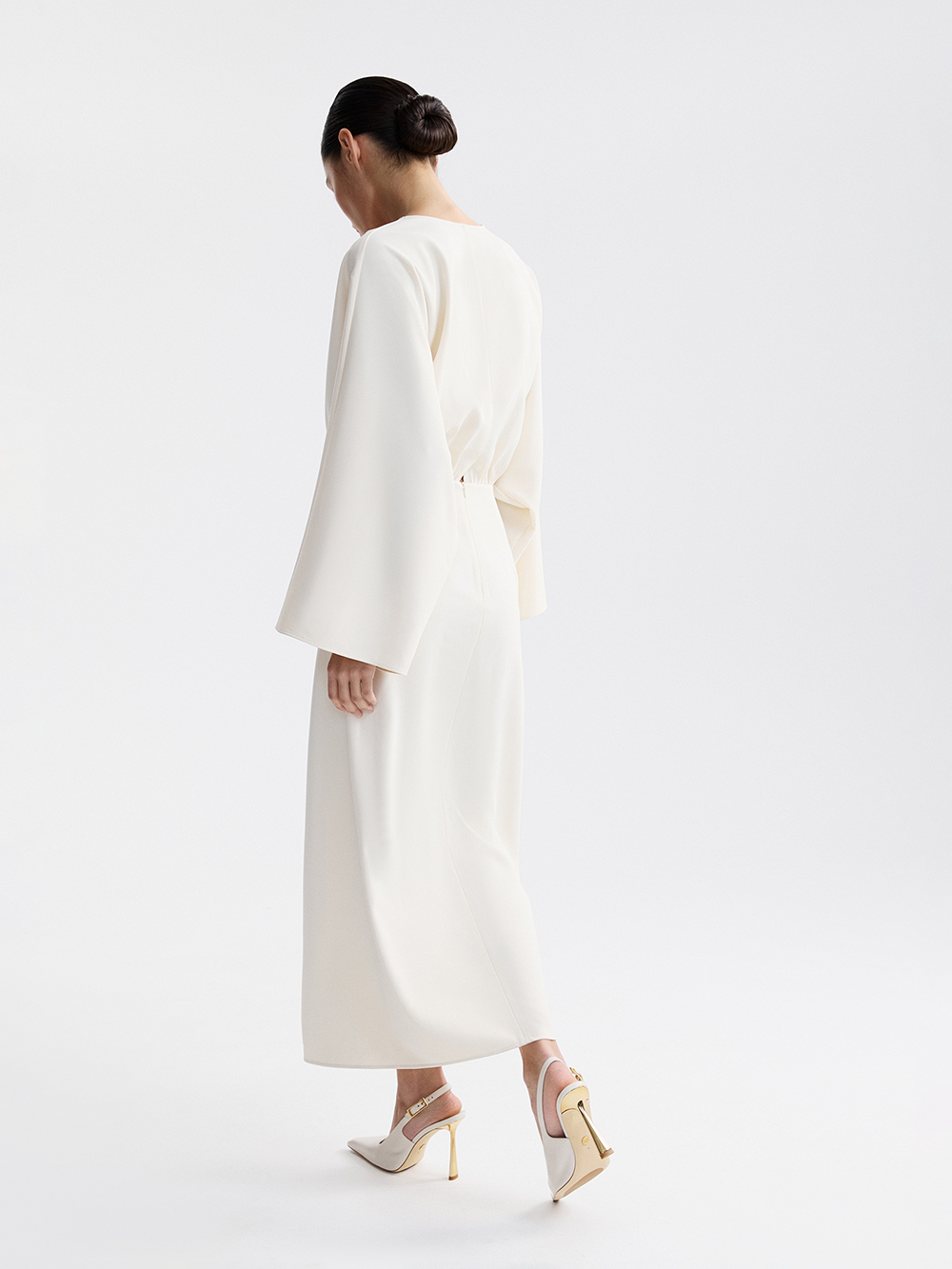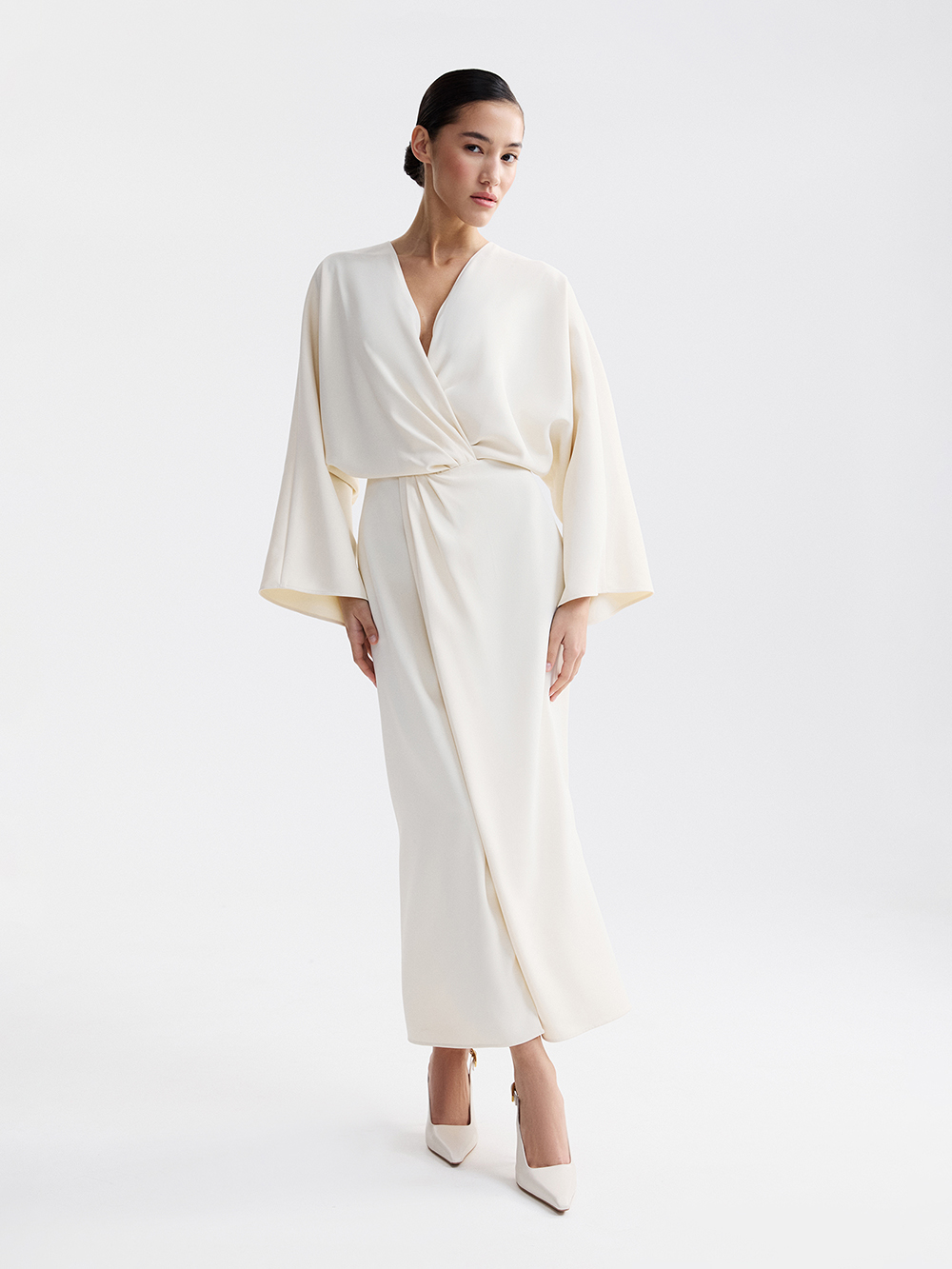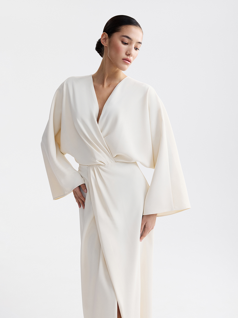 Вечернее платье со сложным эффектным кроем: драпировкой в виде необычного узла на талии, высоким разрезом спереди и продольным вырезом на спине. Широкие рукава добавляют выразительности образу и подчёркивают вечернюю стилистику платья. Платье выполнено из мягкой, красиво ниспадающей по телу ткани с лёгкой фактурой. Застёгивается на молнию сзади, вниз от линии талии.