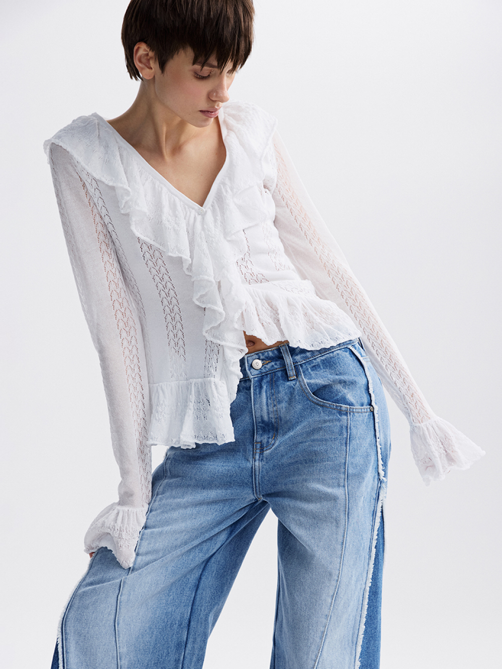 Ажурный вязаный топ – идеальная пара для романтичных образов с джинсами. Комплементарный V-образный вырез и воздушные рюши: вертикальный, по низу и на манжетах. Топ связан из мягкой вискозной пряжи, комфортной и нежной к коже. Доля нейлона в составе отвечает за пластичность, упругость нити и сохранение формы изделия. Топ застёгивается на пуговицы.
