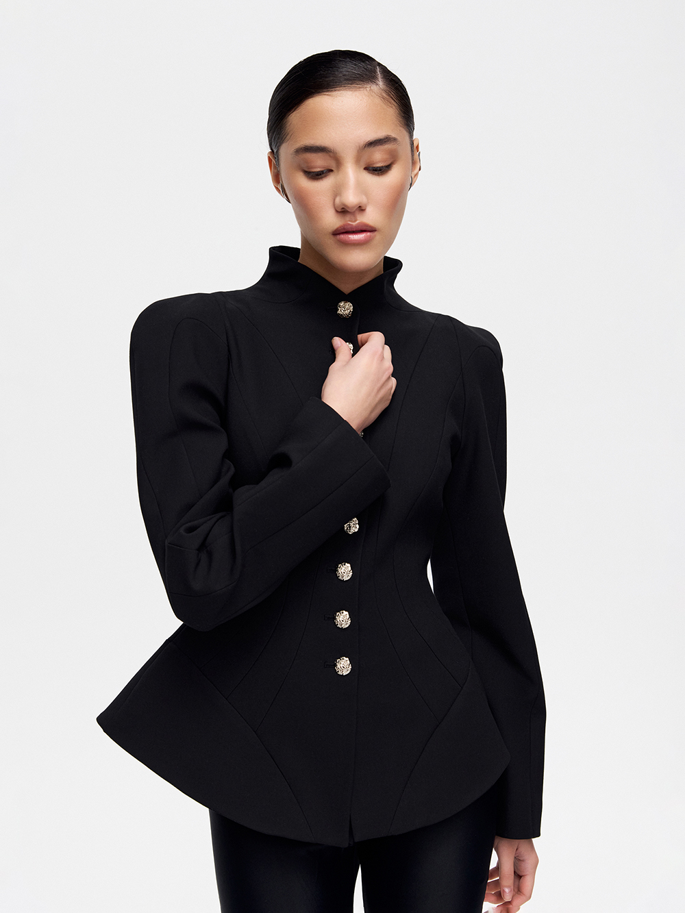 Изящный жакет с металлическими пуговицами вошёл в дроп, вдохновлённый эстетикой русского авангарда. Рукав с высоким плечом, фигурная выразительная баска и акцент на талии усиливают образ. Жакет выполнен из костюмной ткани и дополнен подкладкой с шёлком в составе.