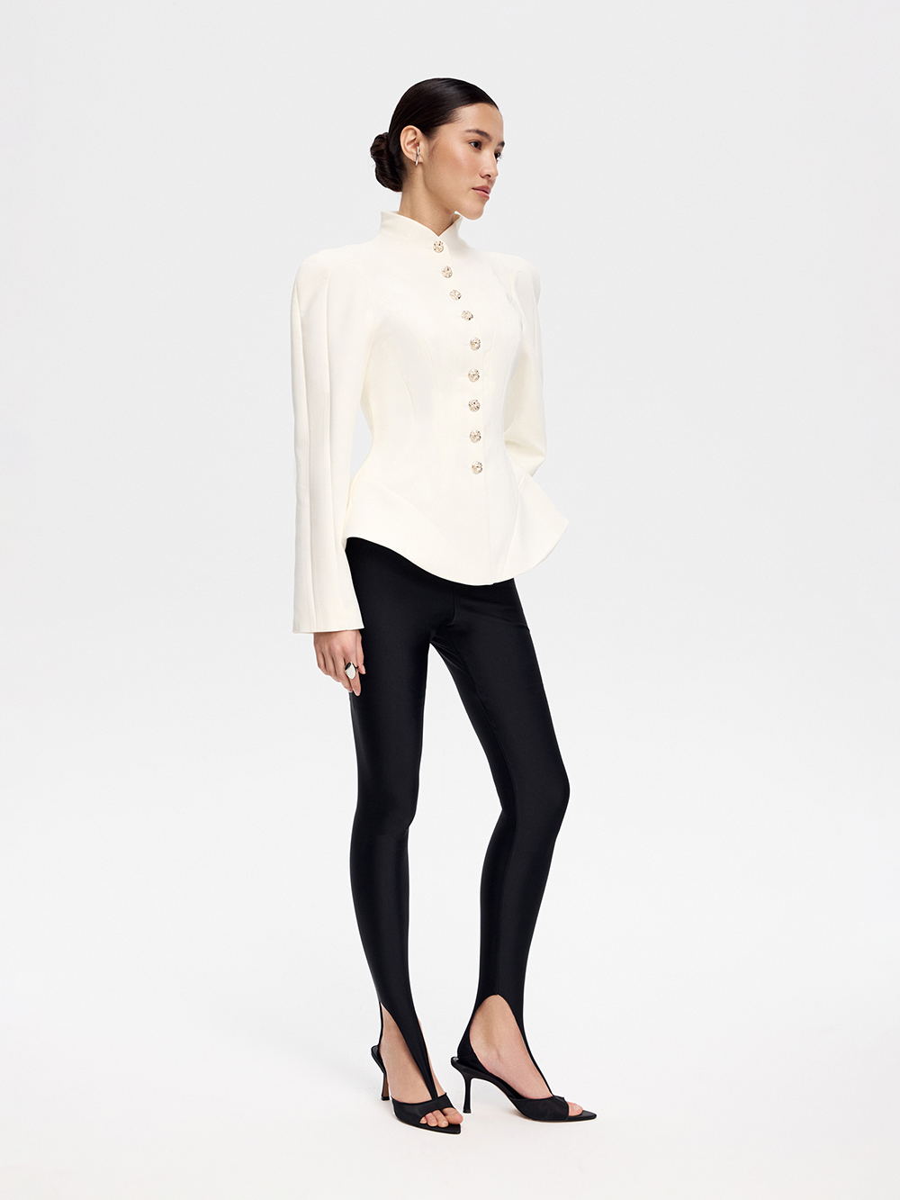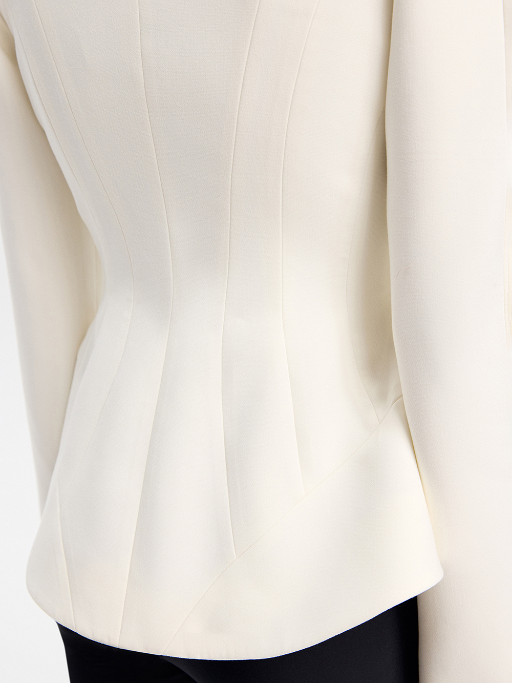 Изящный жакет с металлическими пуговицами вошёл в дроп, вдохновлённый эстетикой русского авангарда. Рукав с высоким плечом, фигурная выразительная баска и акцент на талии усиливают образ. Жакет выполнен из костюмной ткани и дополнен подкладкой с шёлком в составе.