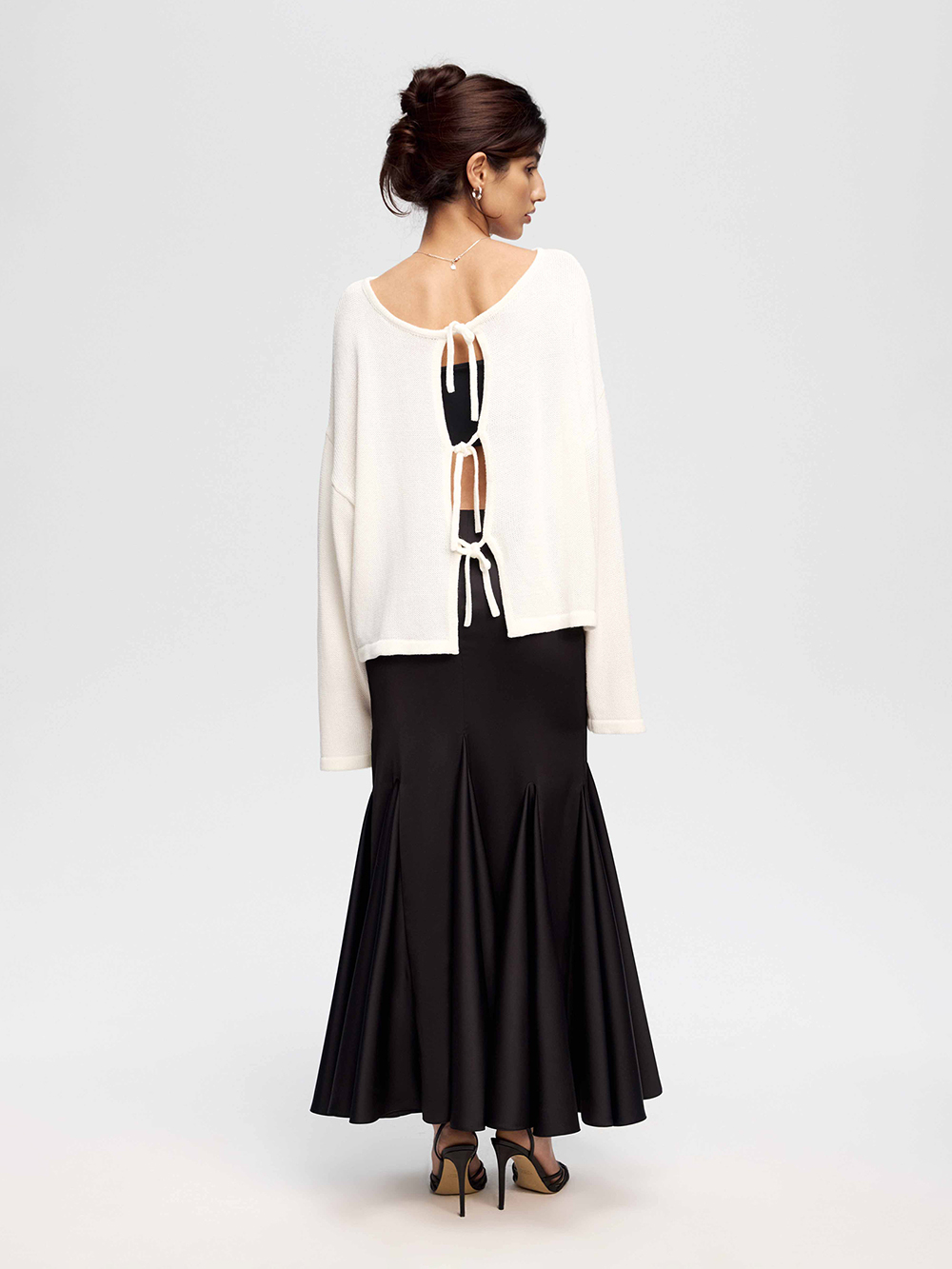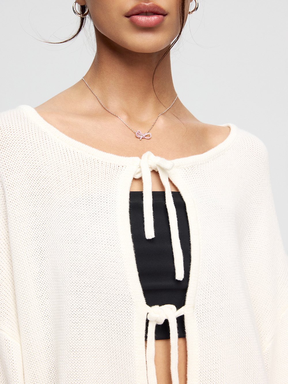 Свободный кардиган на завязках – идеальная пара для джинсов. Кардиган связан из мягкой комфортной пряжи на основе хлопка. Добавление акрила делает её легче и нежнее, а изделию помогает лучше держать форму. Спущенная линия плеча, удлинённый рукав с резинкой и воздушный объём придают кардигану красивую расслабленность.